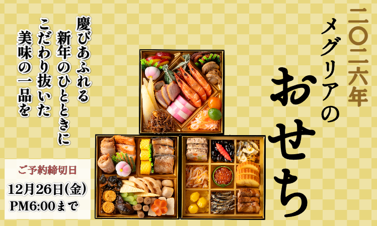 メグリアネットTOP Web予約 【売店限定】ラ・ベットラ・ダ・オチアイ 【売店限定】川上屋 メグリアのクリスマス2025 お手土産スイーツ2026 メグリアのおせち2026 寿司・オードブル 10〜3月【売店限定】秋冬弁当 新着情報NEWS お知らせ一覧 → はじめての方へWeb予約とは おすすめ商品PICK UP ITEM 最近みた商品CHECKED ITEM