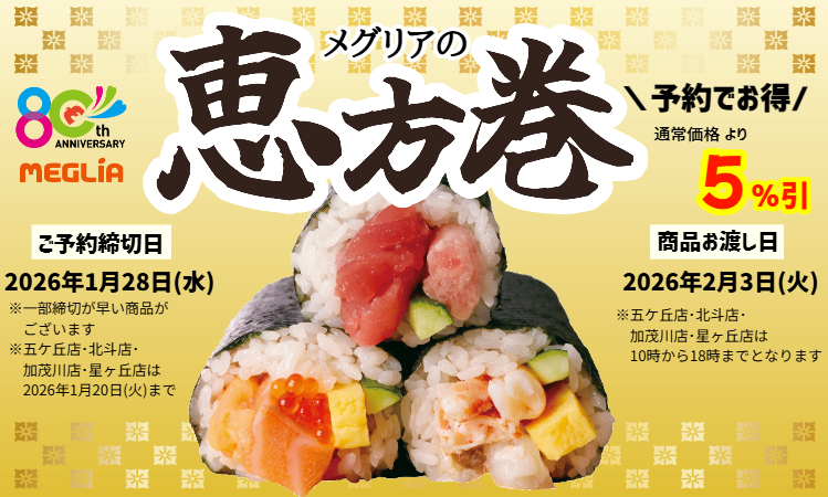 メグリアネットTOP Web予約 メグリアのおせち2026 2026メグリアの恵方巻 寿司・オードブル 10〜3月【売店限定】秋冬弁当 新着情報NEWS お知らせ一覧 → はじめての方へWeb予約とは おすすめ商品PICK UP ITEM 最近みた商品CHECKED ITEM