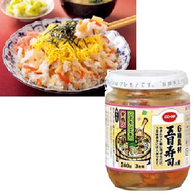 通常価格375円:賞味期限2026.05.26:たけのこ、人参、油揚げ、れんこん、しいたけ、かんぴょうの6種の具材が入ったちらし寿司の素。程よい酸味と、しっかりした具材の食感が特徴です。