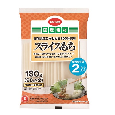 通常価格375円:賞味期限2026.10.11:新潟県産こがねもち米を100%使用したスライスもちです。鍋物やラーメン、お好み焼きやピザ等のトッピングなど、いろいろなアイデアで使用できます。
